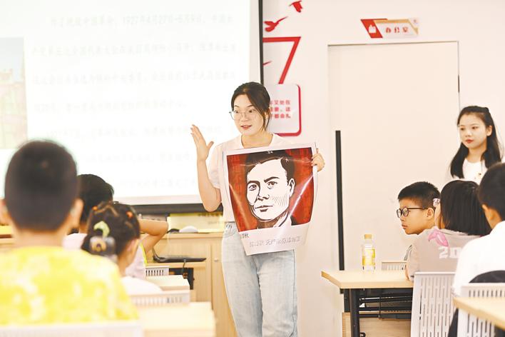8月25日,武昌区新时代文明实践中心,来自湖北大学马克思主义学院的“红巷青马”汪亚平在为青少年进行《学党史·颂英雄》“微宣讲”。
