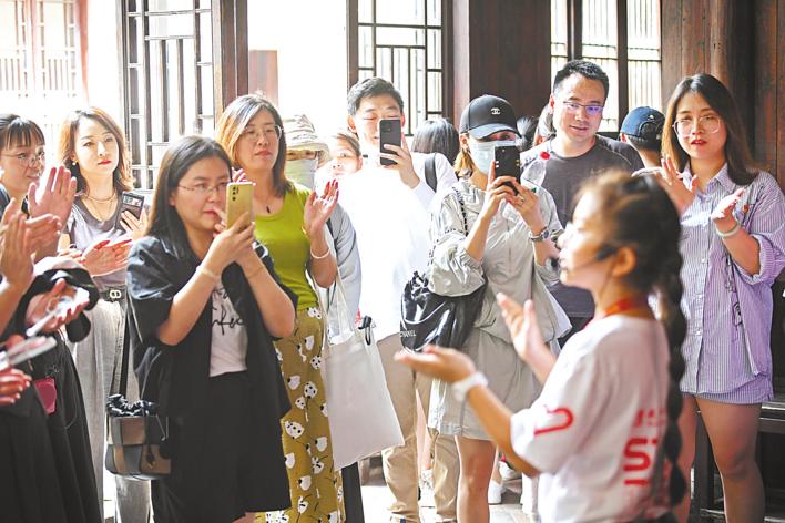 8月26日,毛泽东旧居纪念馆,来自武昌区三道街小学的“红巷苗苗”崔隽熙讲解中唱起了《国民革命歌》,游客纷纷举起手机记录。