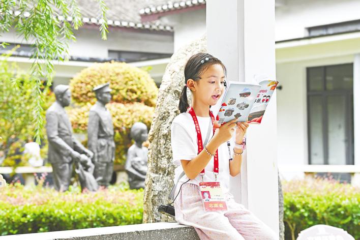 8月25日,毛泽东旧居纪念馆,年仅9岁的武汉市南湖二小“红巷苗苗”张徐蓓利用休息时间复习讲解内容。