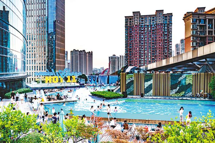 7月7日,在武汉光谷K11商场顶楼“HOT·11天空泳池音乐餐吧”,不少市民游客前来戏水纳凉。 (湖北日报全媒记者 何宇欣 通讯员 肖艺 摄)