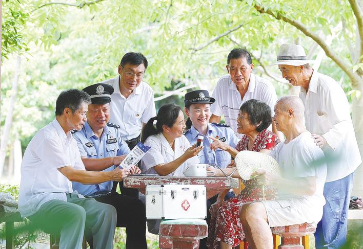 荆门漳河新区社区民警向社区老年群体开展禁毒反诈宣传。