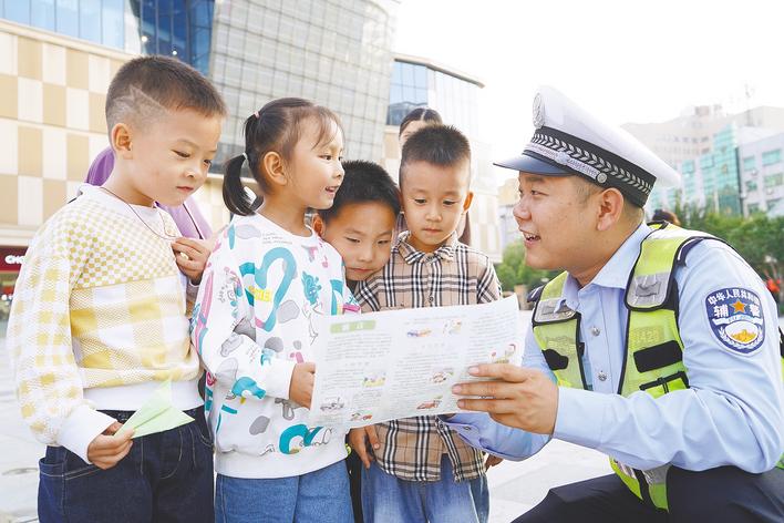 襄阳市谷城县公安局交警宣传交通安全知识。