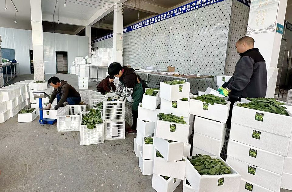 11月28日,在配送中心,工作人员忙着将新鲜采摘的油菜薹装进小巧精致的包装袋里。