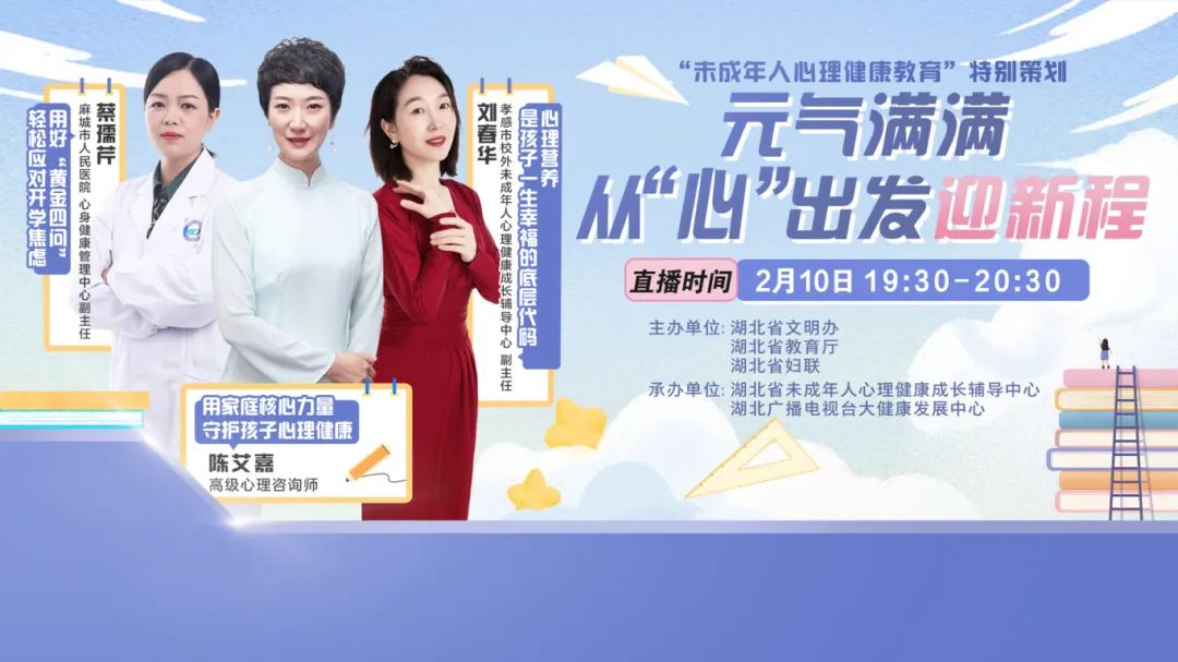 由湖北省文明办、湖北省教育厅、湖北省妇联、湖北省未成年人心理健康成长辅导中心联合湖北广播电视台共同开展的未成年人心理健康教育直播活动,邀请到了三位湖北省未成年人心理健康辅导专家库入库专家,帮助孩子元气满满进入新学期。
