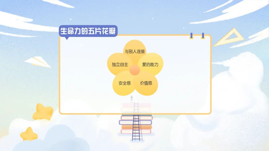 爱的能力、与别人的链接、价值感、独立自主和安全感,这五类心理营养组成了一朵“生命之花”,滋养着孩子成长。当孩子缺乏心理营养时,易出现情绪不稳定、人际关系问题和行为过激的状况。