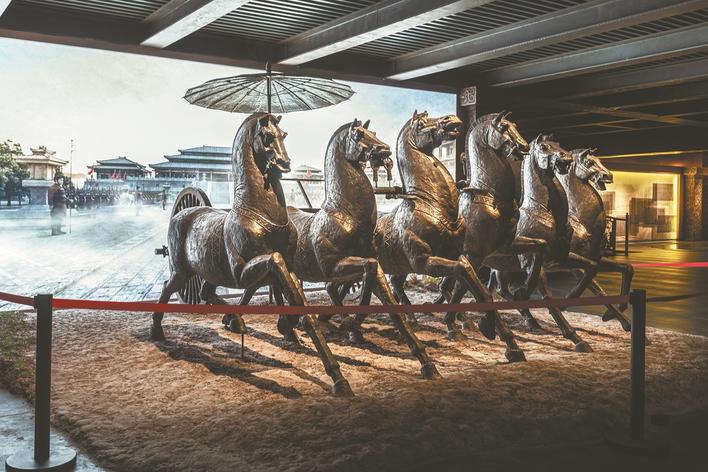 走进熊家冢车马阵展厅,抬眼望去,四十座车马坑所组成的车马阵蔚为壮观,楚国“千乘之国”的国之威势。生动的雕塑再现了楚王车马的威仪,光影沉浸空间让观众走近那段金戈铁马的历史。