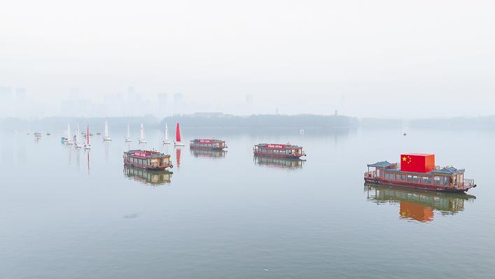 9月28日清晨,在武汉东湖凌波门,以一艘载着巨幅国旗的游船为首,由十余艘帆船、游船等组成的船队驶向曙光。(湖北日报全媒记者 何宇欣 通讯员 高梦雅 摄)
