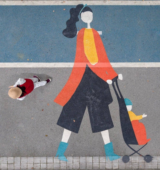 陈嘉丽的《健身步道》组照,拍摄技巧精湛。采用航拍俯拍构图,将健身步道场景完整呈现,富有几何美感;创意融合地面彩绘与真实人物活动,打破现实与艺术边界,充满诙谐活力;对色彩和细节把控出色,增添生活气息。
