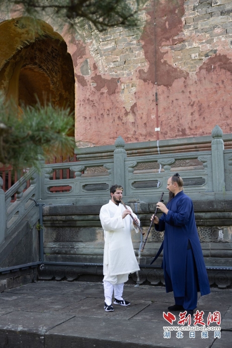 在武当山,美国博主保保熊跟着杰克道长学习了洞箫演奏
