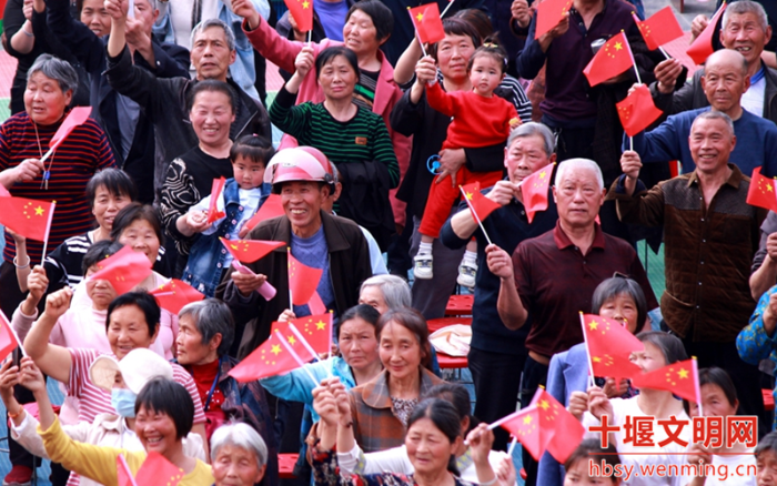 郧阳区刘洞镇文明实践活动现场,群众挥舞国旗,爱国氛围热烈。