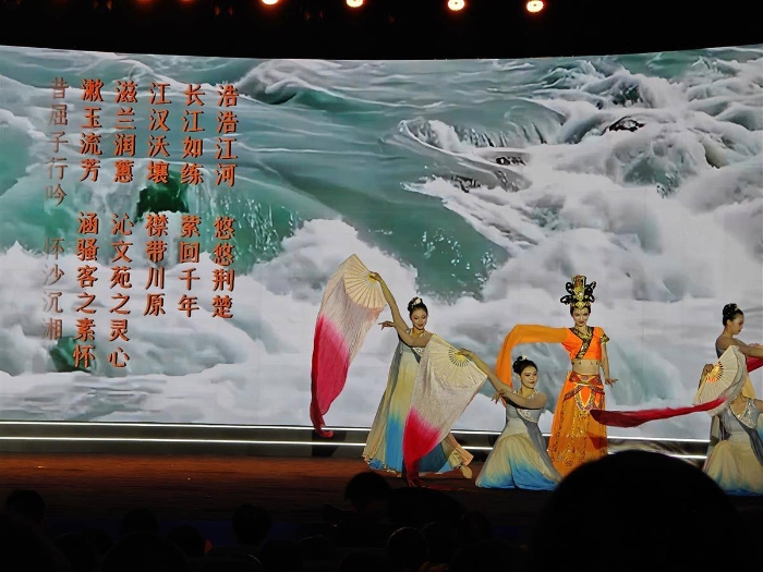 晚会以暖场专题片《长江:文学之河》开篇,循着江流脉络展现长江与文学的相映相生,带领观众沉浸感受“长江是文学追梦人的追溯与召唤”。在序章《江河所赐》中,舞蹈与编钟古琴交织,诗歌与影像交融,荆楚文脉在光影中流淌。