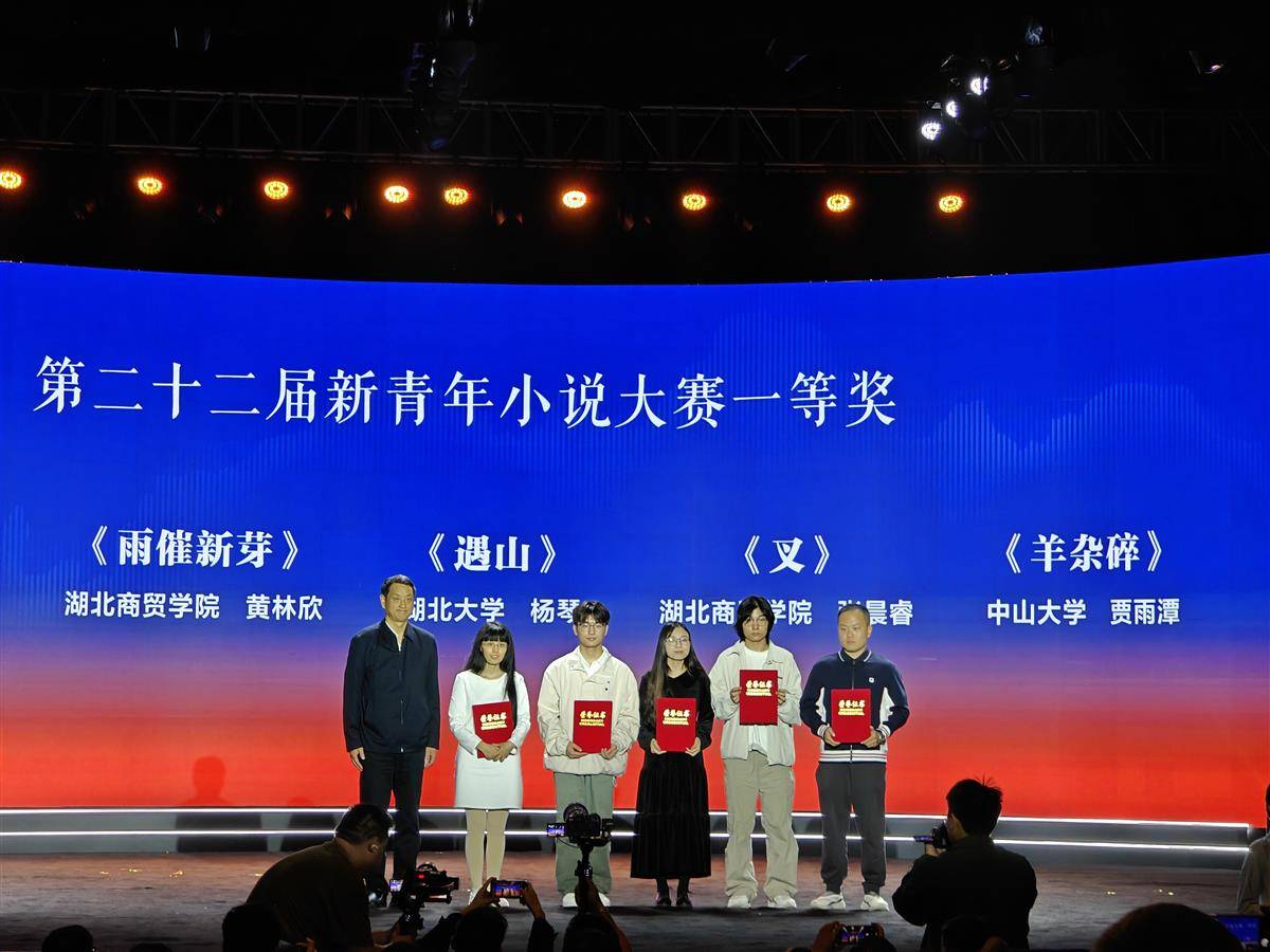 据了解,晚会现场发布的获奖作品中,由湖北省作家协会、湖北省学生联合会和湖北大学联合主办的第二十二届新青年小说大赛共征得稿件352篇。经评委评审,湖北大学杨琴《遇山》等5篇作品荣获一等奖,8篇作品荣获二等奖,10篇作品荣获三等奖;武汉大学等8所高校获“优秀组织奖”,吴昊琳等8位教师获“优秀指导教师”称号。