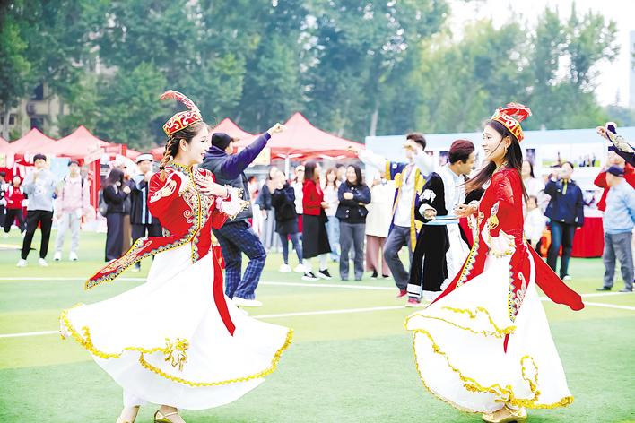 10月25日,华中科技大学“同心筑梦新征程,同行共绘华夏情”第十二届“石榴红”文化节火热开展,身着民族服饰的学生们载歌载舞。(湖北日报全媒记者 何宇欣 通讯员 穆尼热 实习生 何抒澄 摄)