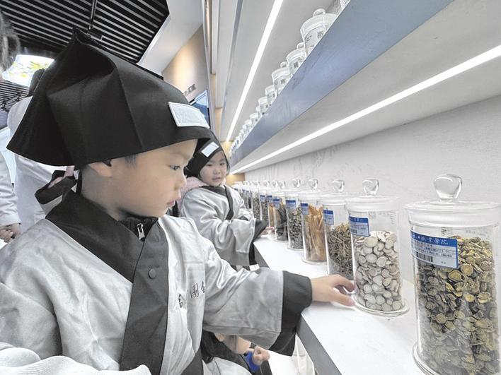中药标本馆内,不仅有琳琅满目的中药标本,更配备了AI虚拟仿真与互动体验设备。百余种珍稀中药标本在AR技术辅助下“跃然纸上”,孩子们通过数字屏触摸“数字中药”,感受跨越地域的中药魅力。