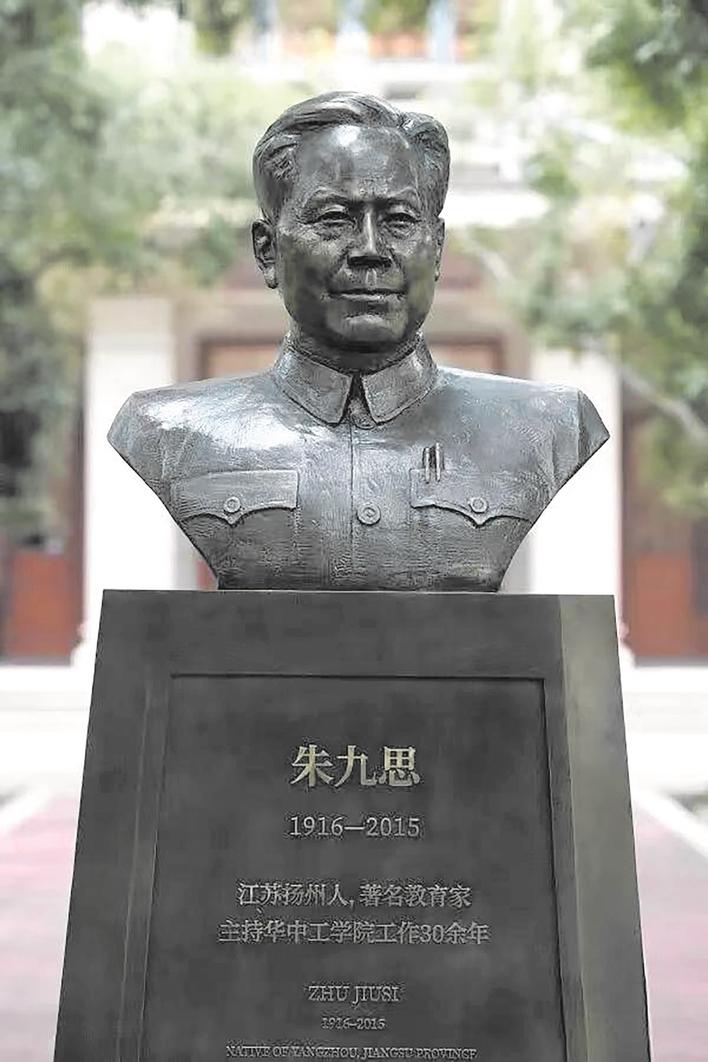 朱九思雕像立于图书馆主馆老馆入口南侧,“敢于竞争 善于转化”景观石旁。这尊塑像的基座上用中英文写道:“朱九思(1916—2015)江苏扬州人,著名教育家,主持华中工学院工作30余年”。