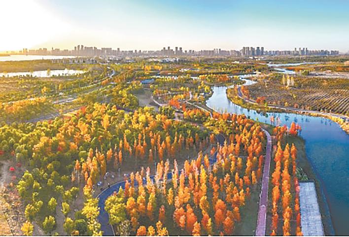 鱼梁洲中央生态公园在秋风中化身为色彩斑斓的童话世界。从高空俯瞰,宛如一幅美丽的油画。每年此时,公园内枫树叶由绿转黄再变红,似调色盘上的绚丽色彩,层层叠叠,错落有致。阳光透过叶缝洒下斑驳光影,为深秋午后增添了温暖与诗意。襄阳古城护城河畔层林尽染,古城、护城河、彩林、步道、城市相映成景,宛如美丽的油彩画,吸引了不少市民和游客前来打卡游玩。