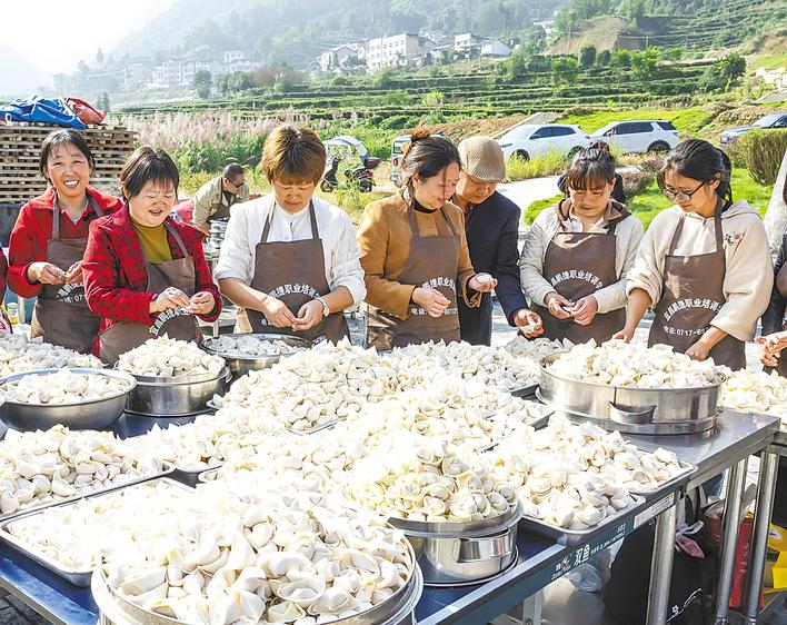 10月28日,秭归县茅坪镇溪口坪村举办千人饺子宴,5名高寿老人同过百岁寿诞。据悉,溪口坪村有4887人,60岁以上村民超千人,该村通过重阳节敬老活动,营造了爱老、敬老的村风民风。 (湖北日报全媒记者 何凡 通讯员 郑家裕 郝明曦 史丽 王钰雯 摄)