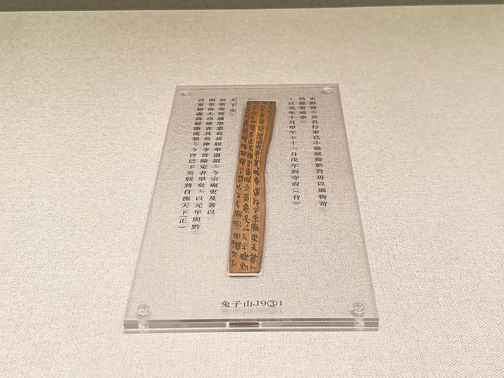 简牍是纸张普遍使用之前最重要的书写载体。从目前发现时代最早的曾侯乙墓竹简,到东晋末年,存续了千年之久。罗恰介绍,此次展出的甘肃武威旱滩坡19号晋墓前凉驸马都尉木牍,由甘肃简牍博物馆收藏,是上展展品中年代最晚的一件简牍文物,年代即为东晋末年。