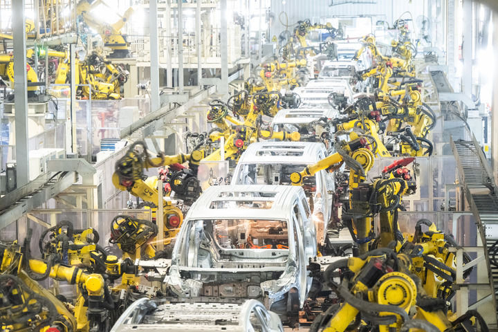 2024年4月1日,在位于湖北武汉经开区的岚图汽车电动化焊装车间,机器人在流水线上作业。新华社记者 肖艺九 摄