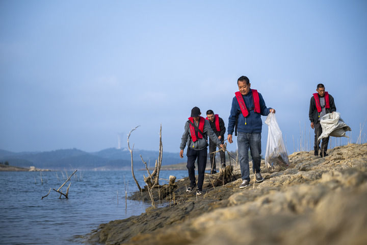 2024年10月28日,清漂队队员在丹江口水库进行清漂作业。新华社记者伍志尊摄