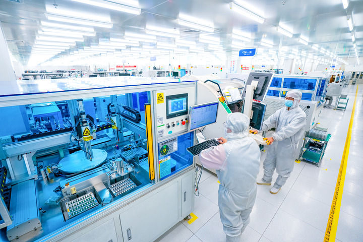 在位于武汉中国光谷的光电器件研发制造商——武汉光迅科技股份有限公司生产车间内,工作人员在光模块生产线作业(2024年2月5日摄)。新华社记者肖艺九摄