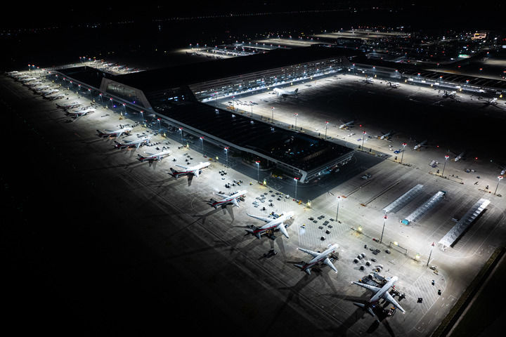 7月11日凌晨拍摄的鄂州花湖国际机场停机坪一角。新华社记者肖艺九摄