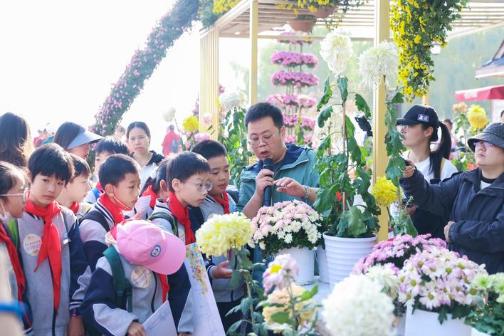 “揭榜挂帅”武汉特色菊花优质品种筛选及景观应用研究项目团队为青少年及市民普及菊花栽培、菊艺鉴赏。(受访单位供图)