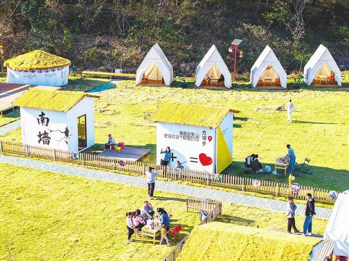 11月22日,英山县方家咀乡四棵枫村,游客及市民在碧枫港露营地打卡休闲,乐享冬日时光。近年来,英山县充分利用乡村生态资源优势,以现代文化艺术与传统田园风光相结合,积极打造集农业休闲、生态游憩、乡村文化于一体的精品乡村生态旅游产业,激发乡村旅游消费新活力。(视界网 王江 摄)