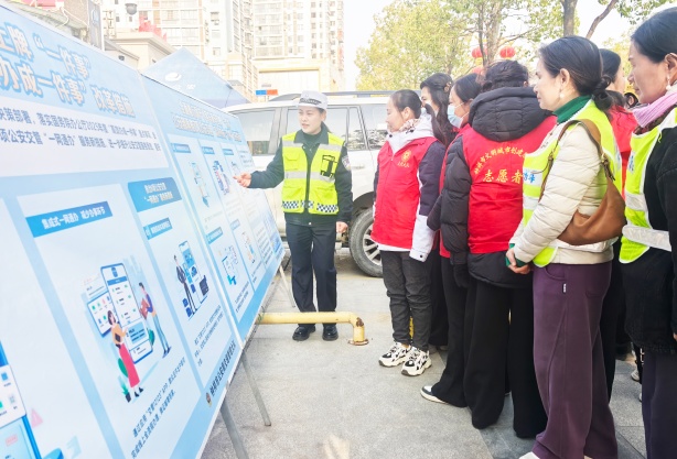 活动现场,数十块图文并茂的展板沿街道两侧排列,酒驾危害、头盔防护作用、闯红灯事故案例等内容直观醒目,不少市民驻足观看。