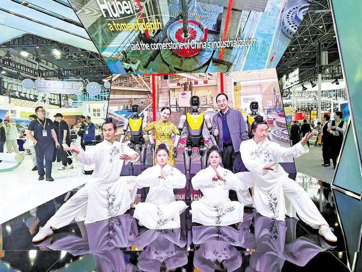 湖北馆最热门的打卡点是“人机共武”:武当山的太极传人与武汉光谷东智的“光子”人形机器人,共同演绎行云流水般的传统太极拳法。机器人团队工程师郑智豪介绍:“我们的机器人是跟着太极传承人学习过的,所以能展示精妙的动作。”