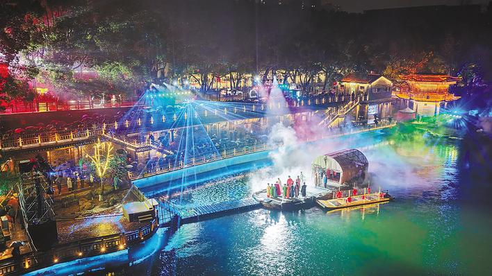 2025年12月31日至2026年1月2日,每晚7时30分开始,咸宁城区潜山脚下月亮湾街区,濯足廊前的淦河水面,将连续3晚上演大型“温泉沸波”实景剧。