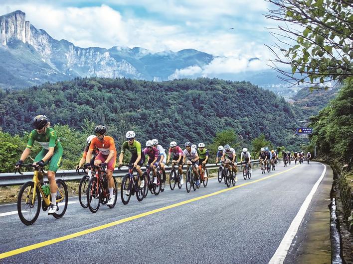 参加2025中国公路自行车公开赛的选手穿越恩施大峡谷—腾龙洞世界地质公园。 (张珑瀚 摄)