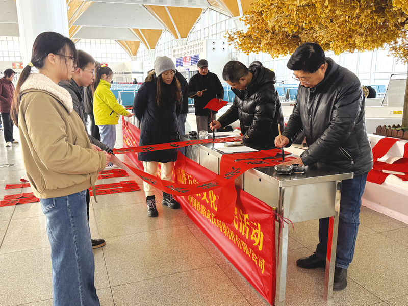 2月2日,2026年春运正式拉开帷幕。随州南站候车大厅内红纸铺展,墨香四溢,中国铁路武汉局集团公司文联联合湖北省文联在随州南站开展2026年“文化列车千里行 送万福进万家”文化惠民活动,向广大旅客和铁路职工送上充满韵味的“文化年货”与浓浓的新春祝福。
