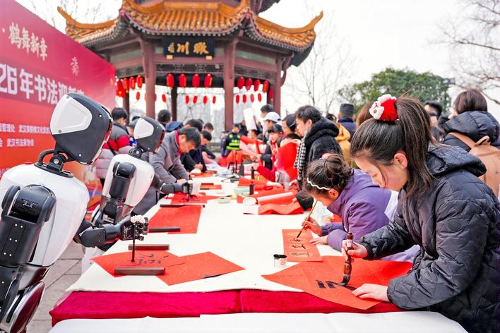 “哇,机器人也会写书法!”2位特别嘉宾引来游客围观。它们是来自武汉手智创新科技有限公司的远游人形机器人,可以通过流畅精准的机械臂运笔挥毫,完成书法作品。小书法爱好者们摩拳擦掌,与它们进行现场PK,一起提笔书写“福”字。一时间墨香四溢,勾勒出一幅生动的“新春挥毫图”。