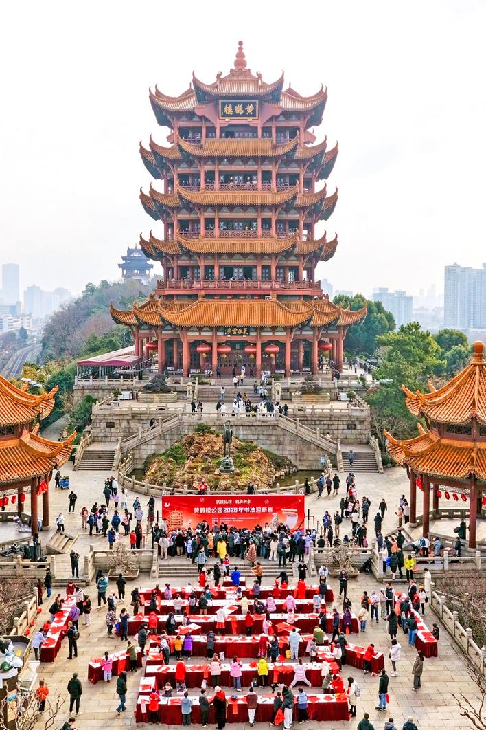 2月7日上午,黄鹤楼前“春”意浓,黄鹤楼公园2026年书法迎新春活动举行,为全国各地游客呈现了一场传统与现代交融的迎春文化盛宴。