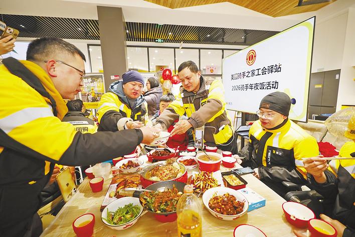 2月9日,农历腊月二十二,美团武汉工会主办“2026年骑手团年饭”活动,为武汉光谷及周边的美团骑手送上一桌桌温馨满满的“骑手团年饭”。