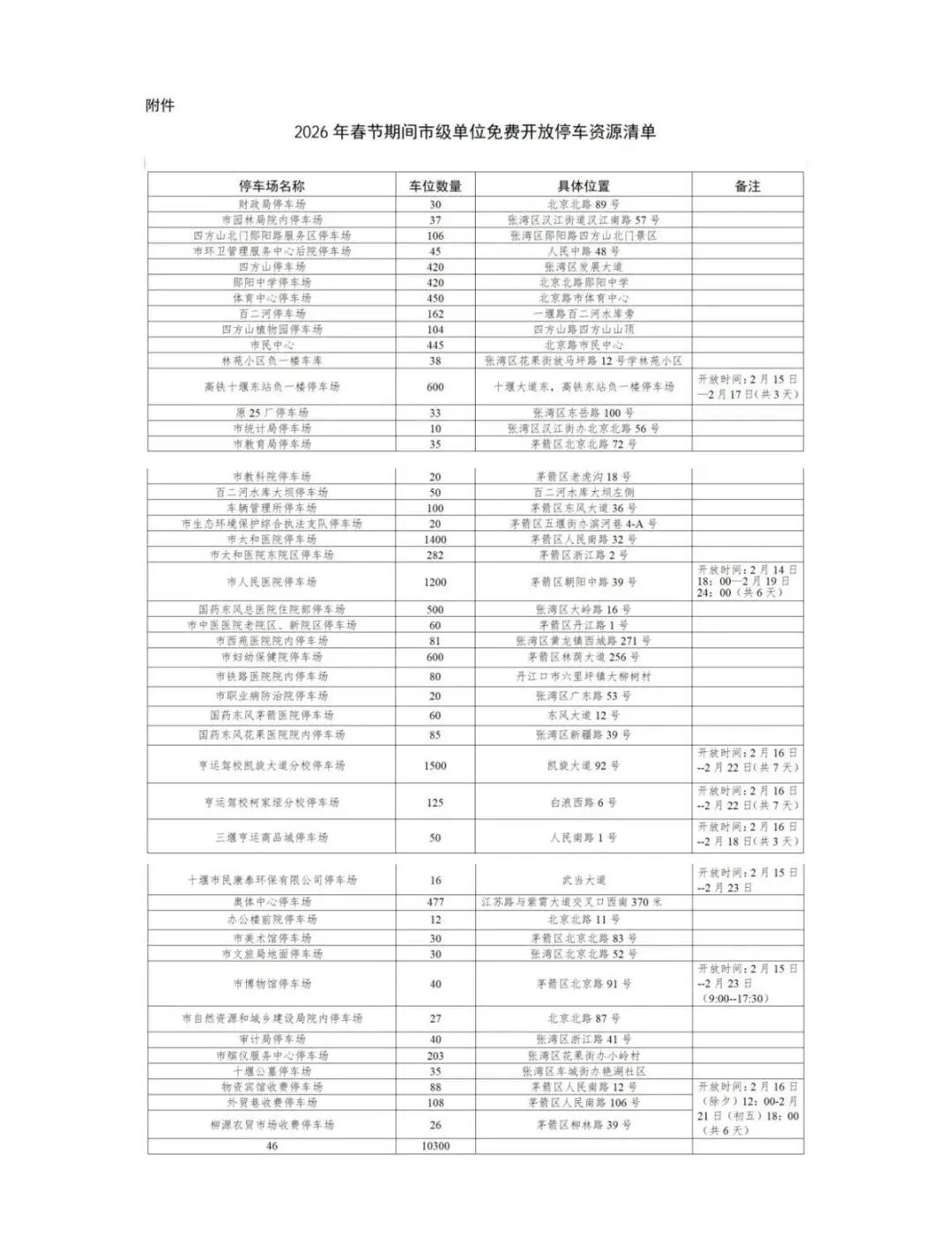 今年春节期间,十堰城区多家单位、46个停车场,共计10300个停车泊位将免费开放(仅限于公安交管部门登记的七座及以下小型普通客车)。据了解,这些停车场免费开放时间为2月14日18:00至23日18:00,少数停车位有特殊时间要求,具体以下图时间为准。