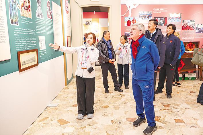 随后,鲁玥菡带着巴赫一行参观体育文化展。展览主题是“体育精神 跃马争春”,有中国传统的马文化、棋文化、蹴鞠文化,还有一件特别的展品——一个古代彩绘游戏盒,上面画着击剑的场景。