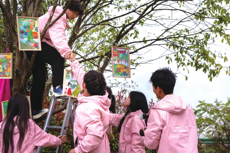 除墙绘外,实践团还在古树下举办“龙池印象”林间画展,数十幅以龙池山水、民俗风情为主题的画作悬挂于枝头,为村民打造家门口的美育课堂。
