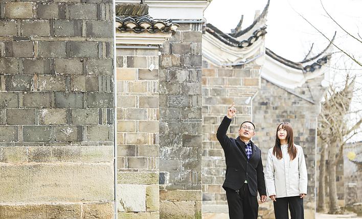 祝辉(左)向湖北日报记者介绍红安县祝家楼村古居。 (湖北日报全媒记者 成熔兴 摄)
