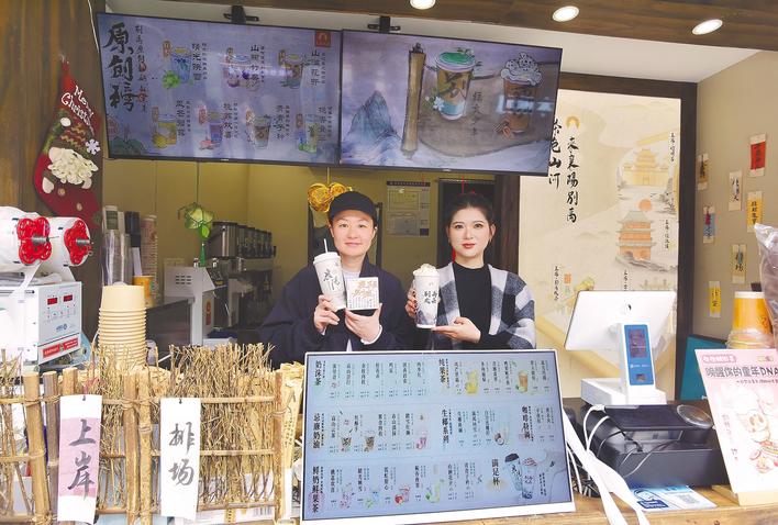 “把门店开在北街,就是想让外地游客喝到独具襄阳特色的鲜奶茶。”周子渝身着工装,熟练地为奶茶点缀奶花;一旁的别梦婕快速核对外卖订单,点单、制作、出单,有条不紊。