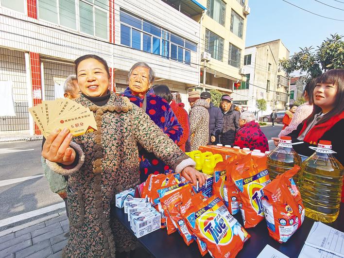 积分从何而来?村民参与公共事务即可获得积分。三湖村金婚家庭分享家风故事,每户可获50积分;花开十月度假村“花朝节”和油菜花海旅游节期间,村民参与布置、引导、保洁、表演等任务,投工投劳即可获得积分;在合心村,主动参与调解家庭矛盾纠纷的村民,可获睦邻合家积分。此外,每周五固定的“清洁家园日”以及端午节包粽子、中秋节做月饼等活动,也都成为村民获取积分的途径。