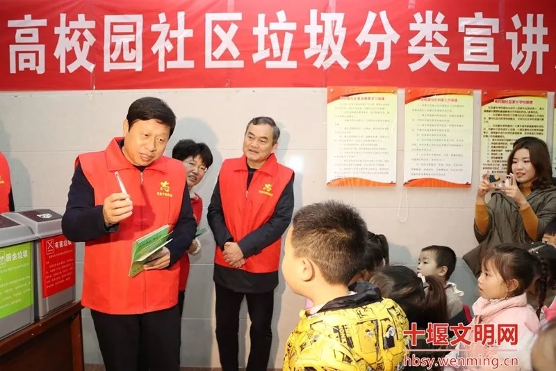 2019年11月14日,市委书记张维国深入茅箭区二堰街办高校园社区,向市民和小朋友们宣传垃圾分类知识。