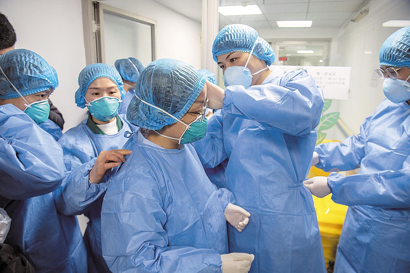 1月26日,即将进入隔离病房开展工作的上海医疗队队员互相整理防护服装。 (湖北日报全媒记者 魏铼 摄)