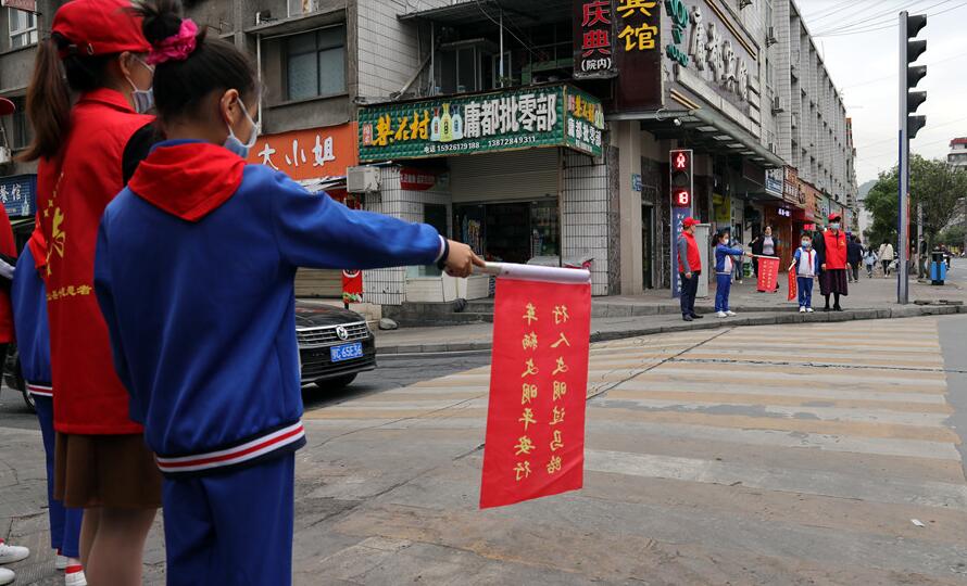 5月13日,竹山县张振武小学5名小学生及家长志愿者服务队员在人民路、沿河路主要交通路口开展文明交通劝导服务,劝导行人走斑马线;辅助需要帮助的人安全通过斑马线;派发文明交通宣传单等。