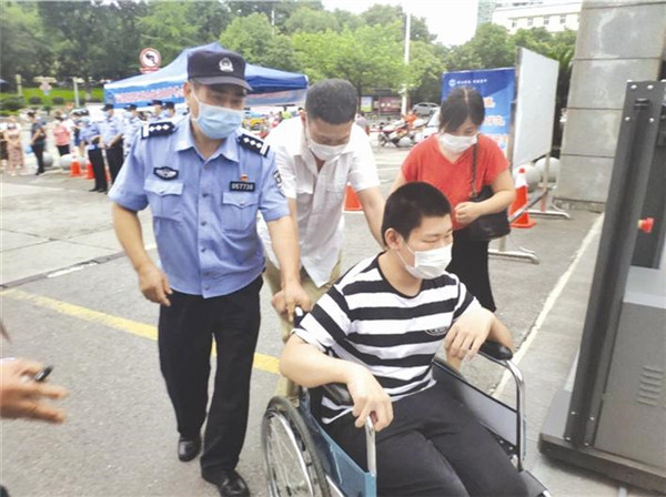 考生小杜是市一中高三(17)班学生,高考前因打球意外受伤,导致脚踝骨折,行动不便,学校将这一情况反映给教育部门后,高考当天,小杜在点军交警的护送下,坐轮椅参考,并提前十分钟(7:50)进入市一中考场。小杜父母向工作人员表示感谢,说道:“感谢各部门工作人员的关心,让孩子免去了排队进考场的不便,希望孩子能调整好节奏,考出好成绩!”在保证学生正常入校的同时,为保证伤残学生能顺利参加高考,市一中考点专为伤残学生特别开设绿色通道,并安排专人提前将学生护送至考场。