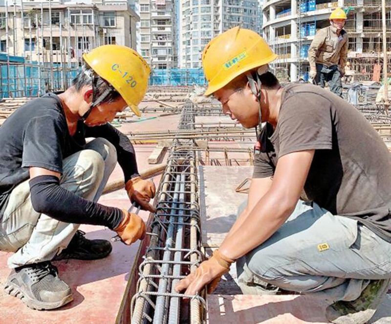 在2楼操作平台上,钢筋工闫大军、宋满满戴着厚厚的手套,正在有条不紊地绑扎钢筋,两人脸上豆大的汗珠直往下滴。不远处,塔吊指挥员黄亚娜站在平台上,仰望高空,拿着对讲机指挥塔吊司机吊装钢筋等建筑材料。为了防暑,她“全副武装”,不仅戴了作业必备的安全帽,还特意戴了防晒帽,在脖子上围了防晒围巾,手臂穿上防晒袖套。“塔吊起吊、装卸材料过程中,我必须在现场时刻盯着,所以要做好防晒防暑措施。”她说。