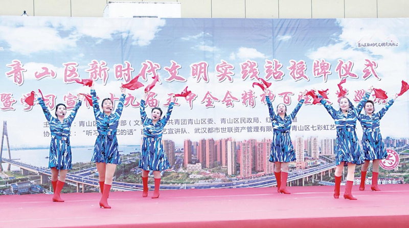 “文明新时代 实践青山行”,12月5日是国际志愿者日,武汉市青山区在八大家红坊里广场举行新时代文明实践站授牌仪式暨学习宣传党的十九届五中全会精神百姓文艺巡演活动,加快在全区迅速掀起学习宣传贯彻五中全会精神热潮、大力推进新时代文明实践中心(站所)建设。