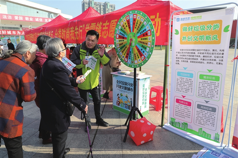 包括市城管局在内,市公安局、司法局、文旅局、卫健委等部门志愿服务队,在市体育广场摆摊设点,为过往市民提供垃圾分类、普法宣传、文明旅游、义诊等志愿服务,吸引了不少市民参与。