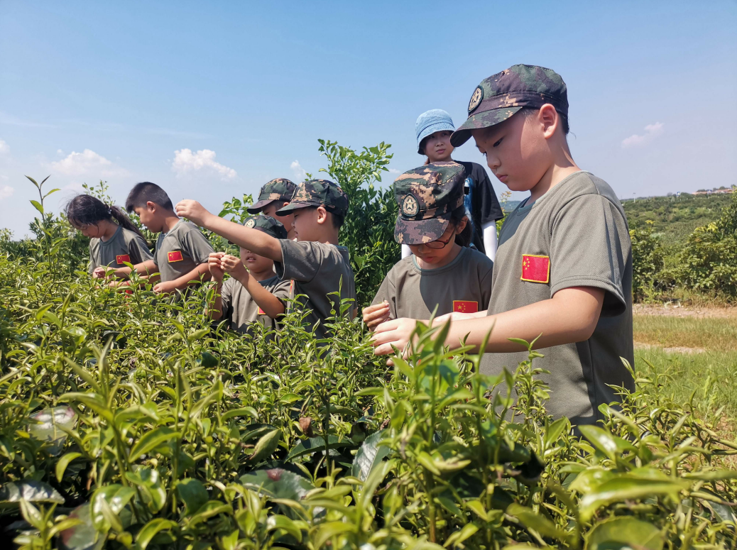 鄂州市学生暑期夏令营组织学生到梁子湖区综合实践基地采摘茶叶。图片来源:鄂州市委文明办供图